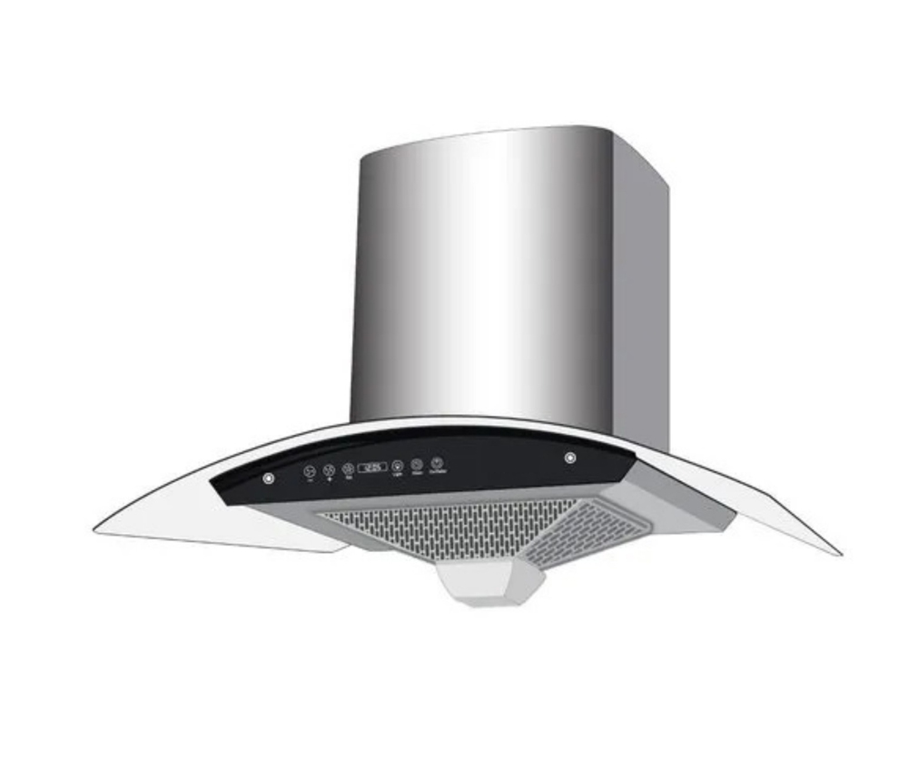 This is a sleek and modern Wall-Mounted Kitchen Chimney featuring a dramatic Curved..